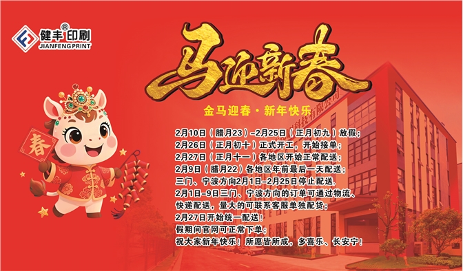 26年春节放假通知:2月10日(腊月23)-2月25日(正月初九)放假;2月26日(正月初十)正式开工,开始接单;2月27日(正月十一)各地区开始正常配送;2月9日(腊月22)各地区年前最后一天配送;